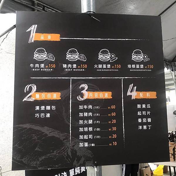 漢堡種類有:牛肉堡、豬肉堡、培根蛋堡、火腿蛋堡