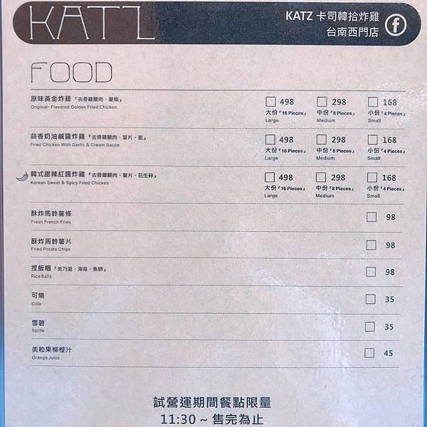 【臉書】:KATZ卡司韓拾炸雞 台南西門店