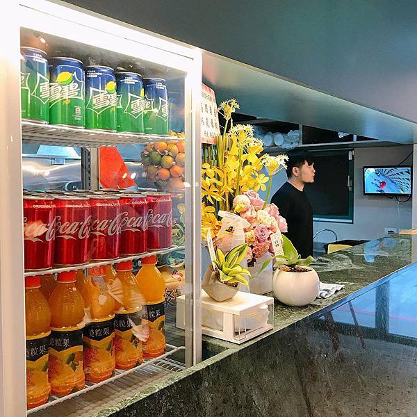 一旁架子上有白開水、餐具、面紙供客人使用。