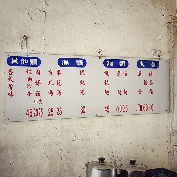 賣著炒類、麵食、湯品、肉燥飯、紅油抄手、滷菜。